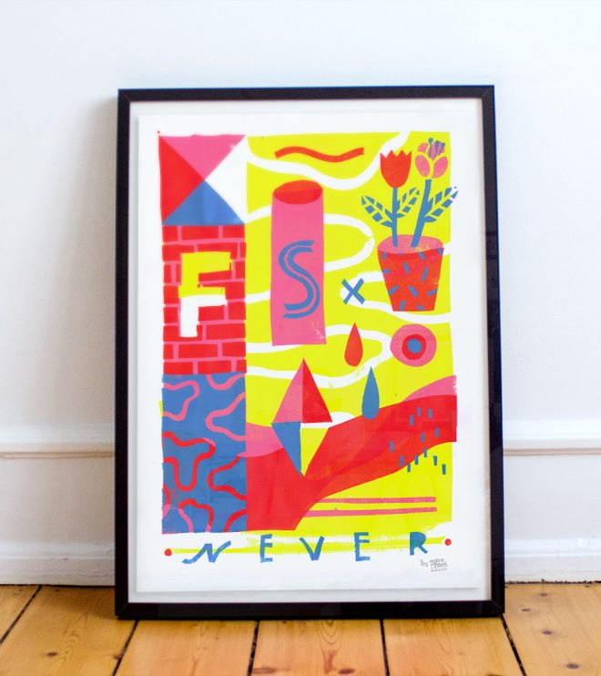 Dreifarbiger Kunstdruck. Risographie mit starkem Vollton- Neon(pink)farbauftrag, DINA4 auf weissem, hochwertigen Druckpapier (240g/qm, Munken).